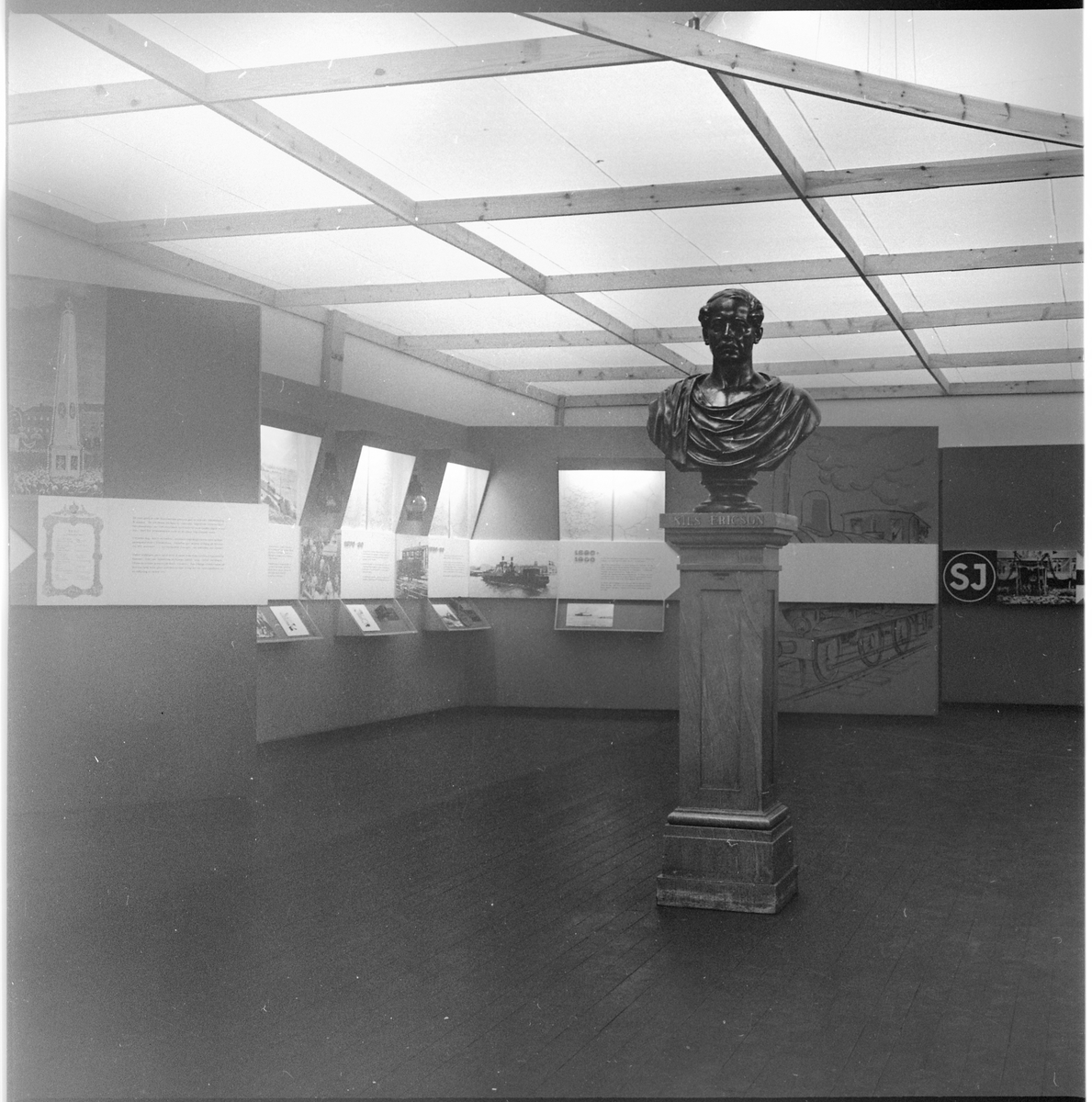 Interiör innehållande diverse foton med information samt en byst i centrum vid utställningen i Göteborg 1962.