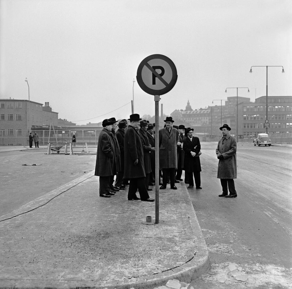 Visning av vägbussar, Klarabergsviadukten. Generaldirektör Erik Upmark närmast kameran.