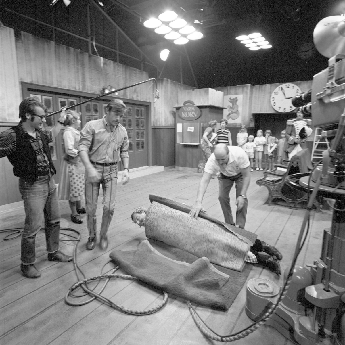 Titel: Studiomän och skådespelare under TV-inspelning av adventskalendern "Klart spår till Tomteboda".
