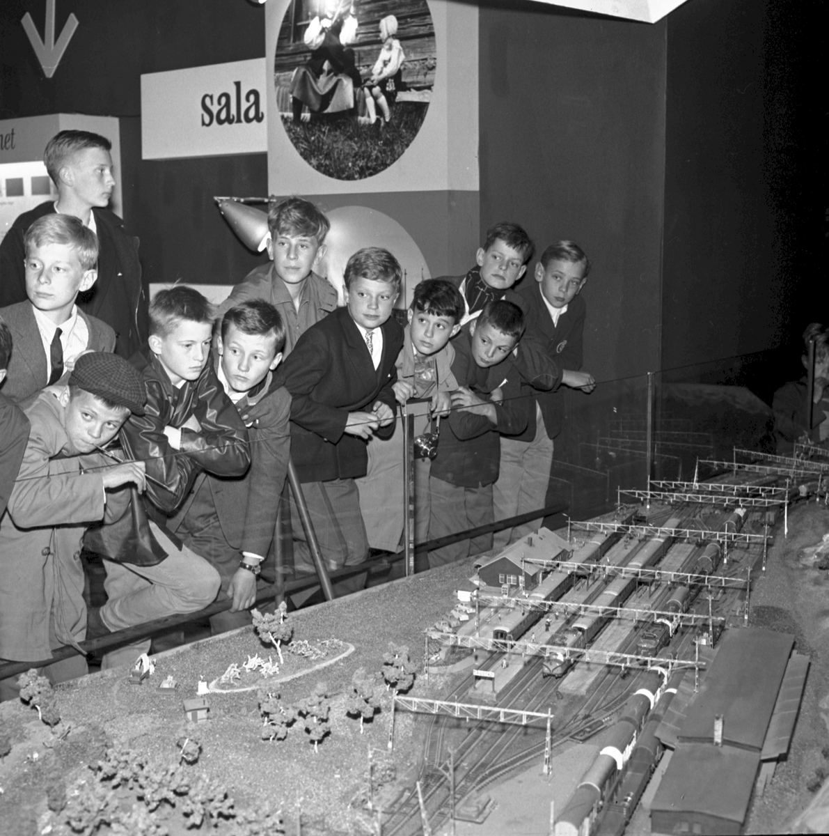 Titel: Statens Järnvägars, SJ, modelljärnväg. Kronprinsen med skolkamrater från Broms skola besöker modelljärnvägsutställnigen, på Gröna Lund.
