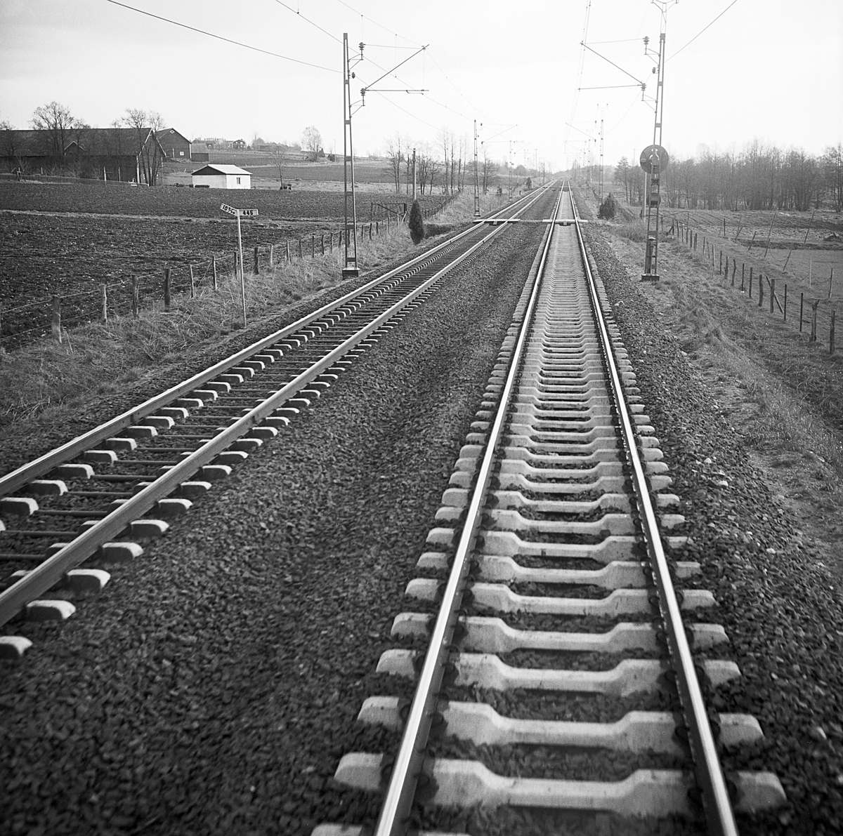 Dubbelspår med 2 typer av betongslipers. Järnvägsövergång och en lutningsskylt