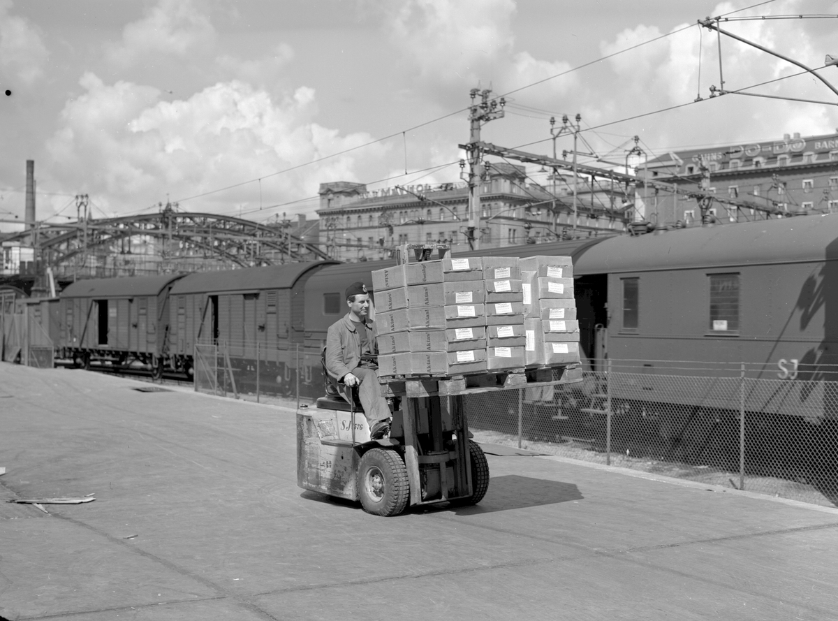 Titel: Gaffeltruck med pallgods. Resgodsvagnar och godsvagnar skymtar