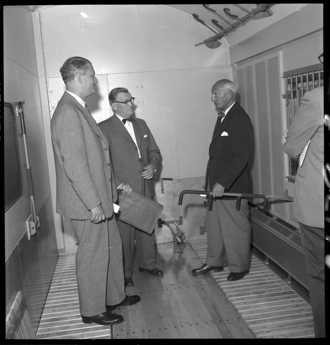 Titel: Statens Järnvägar SJ BFo4 pressvisas på Centralstationen i Stockholm. Generaldirektör Upmark, Byråchef Jonson, Byrådirektör Larberg och Byrådirektör Andersson deltar vid visningen.