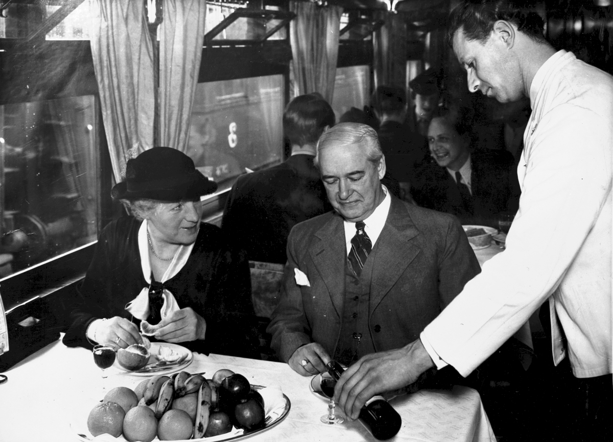 Statens Järnvägar, SJ restaurangvagn. Där serveras frukt och vin.