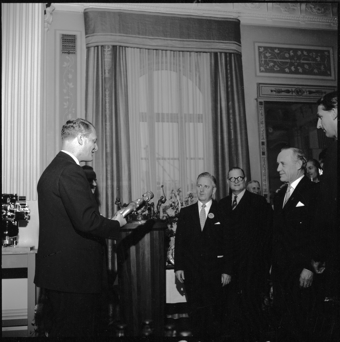Generaldirektör Erik Upmark tar emot gåvor från Stockholms Saltsjöns järnvägar SSnJ, NOHAB, St. Kopparberg, Kockums, LME.