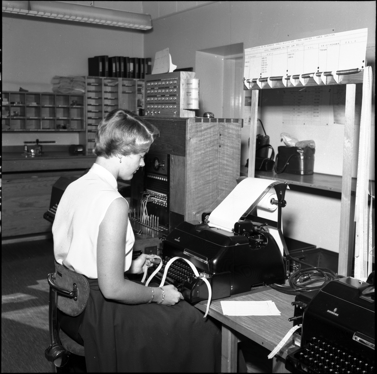 Kvinna i arbete med telexanläggning på Centralstation i Stockholm.