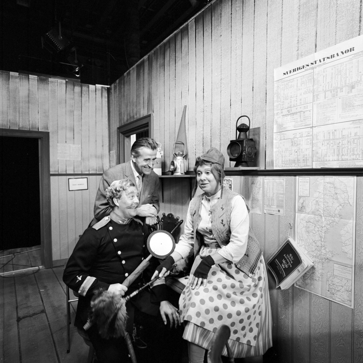 Titel: Studiomän och skådespelare under TV-inspelning av adventskalendern "Klart spår till Tomteboda".