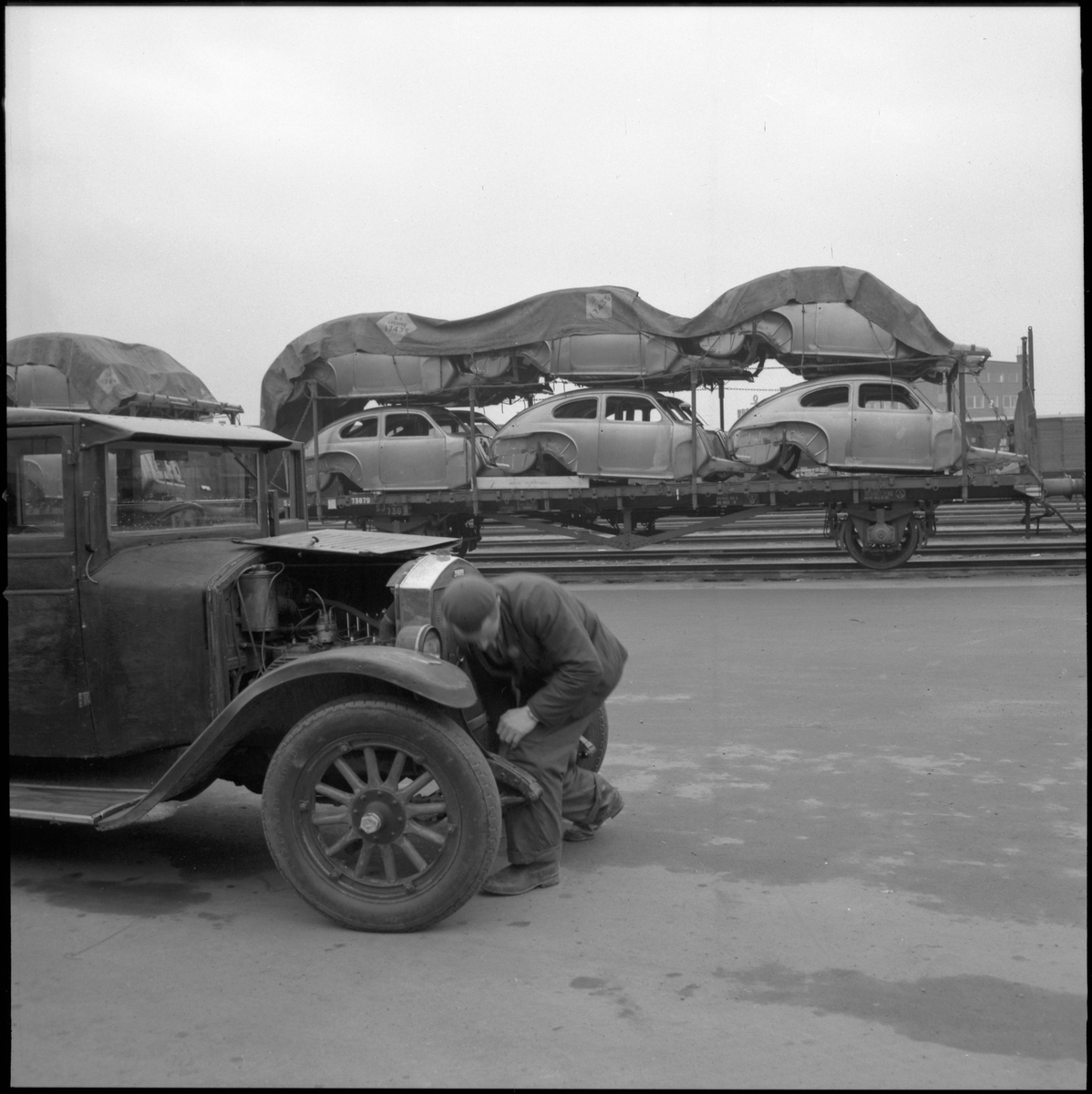 Statens Järnvägar, SJ 73879 Godsvagn öppen. Volvo personbil .Transport av bilkarosser.