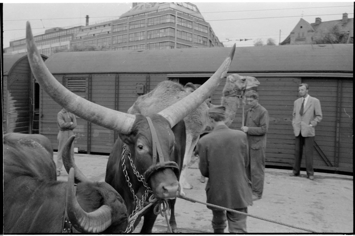 Avlastning av djur från godsvagn.