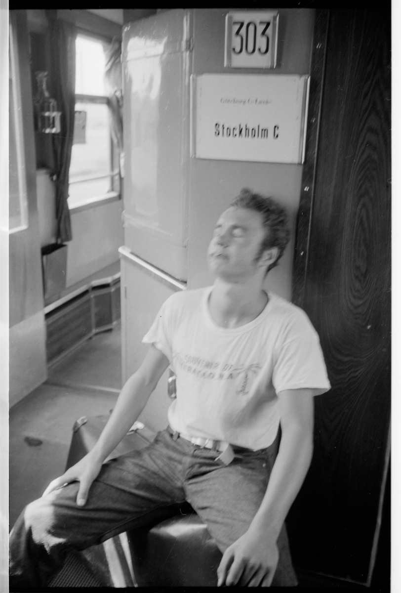 Ung man som tar en rökpaus i vagnskorridoren, någonstans på linjen mellan Göteborg C - Laxå - Stockholm C.