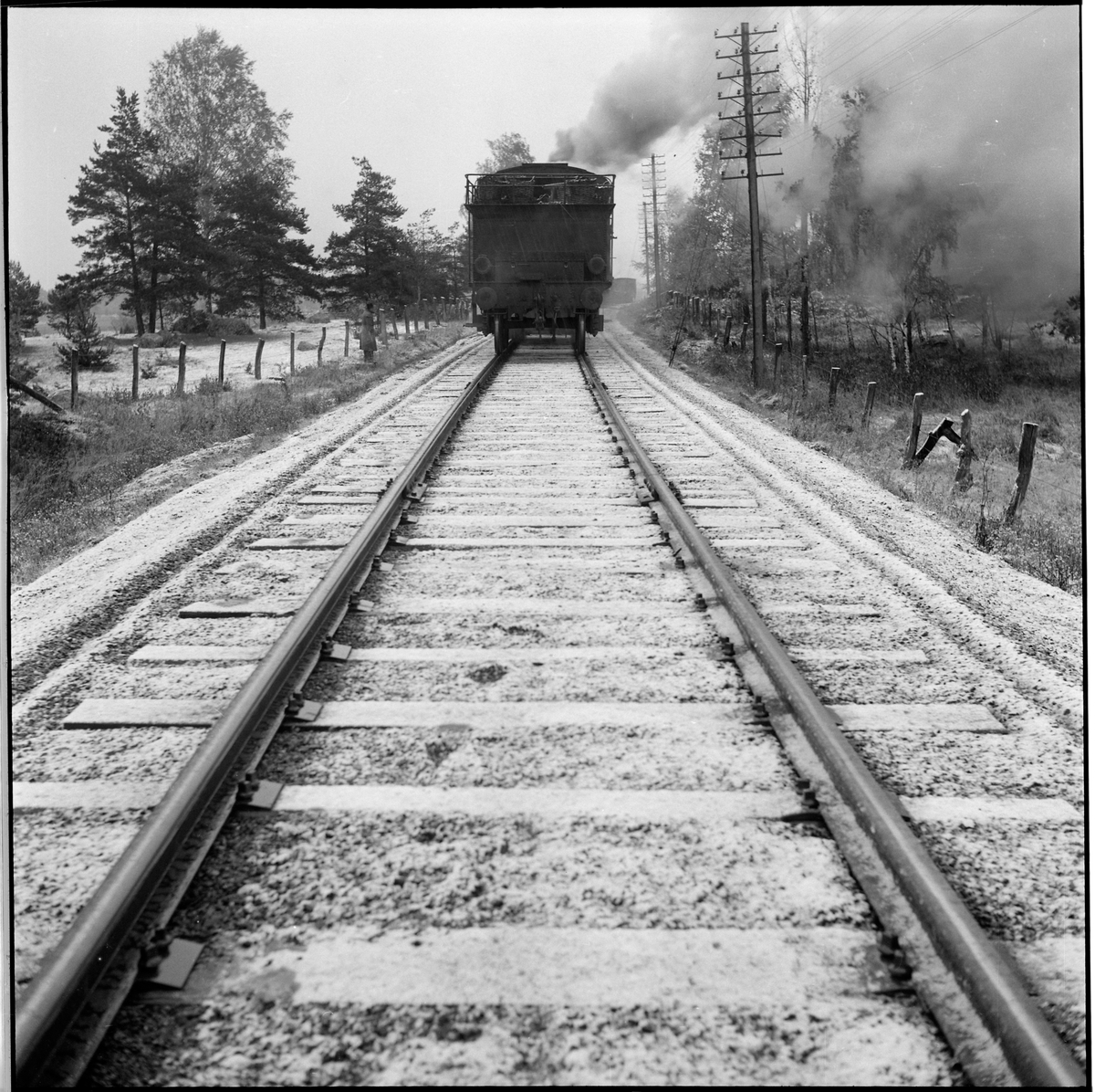 Kabelutläggningståg. Nedplogning av telekabel i banvallen inför elektrifiering av tågdriften. Tåget dras av ett N-lok med tillkopplad K-tender. Detta gav större vatten- och kolförråd så man kunde var ute längre tid innan förråden behövde fyllas på.