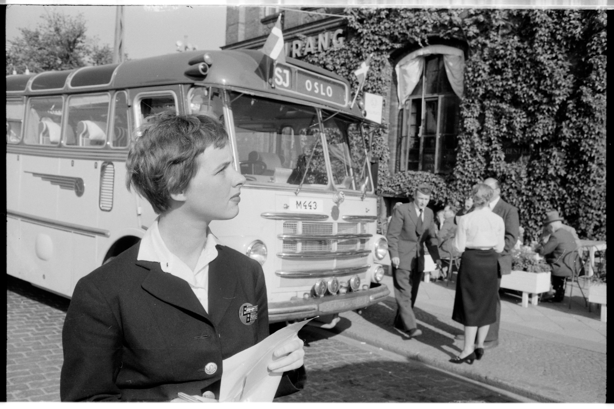 Bussvärdinna och resande vid, Statens Järnvägar, SJ buss till Oslo. Här vid Malmö centralstation.