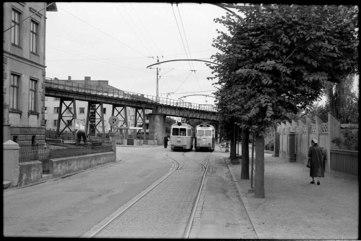 Vid Västkustbane viadukten på Drottninggatan vid Halalid står Helsingborgs Stads Spårvägar, HSS spårvagnar vid hållplats på linje 1.