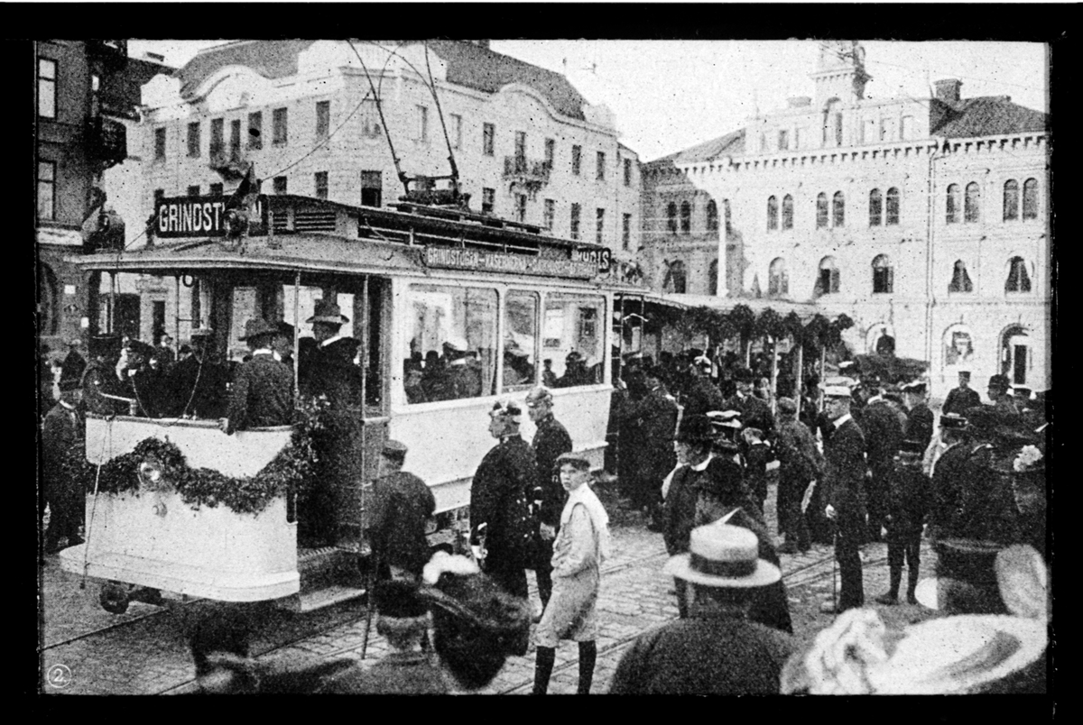 Titel: Folksamling vid invigning av Uppsala Spårvägar invigning på Stora torget.