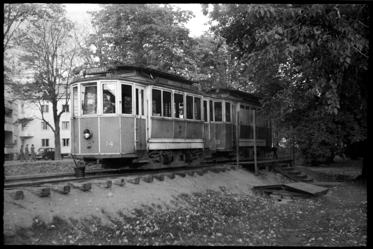 Gävle Stads Spårvägar, GSS 14, 12 vid hållplats i Stadsträdgården. GSS 14 trafikerade blå linjen, Albion - Södra och Norra Kungsgatan.