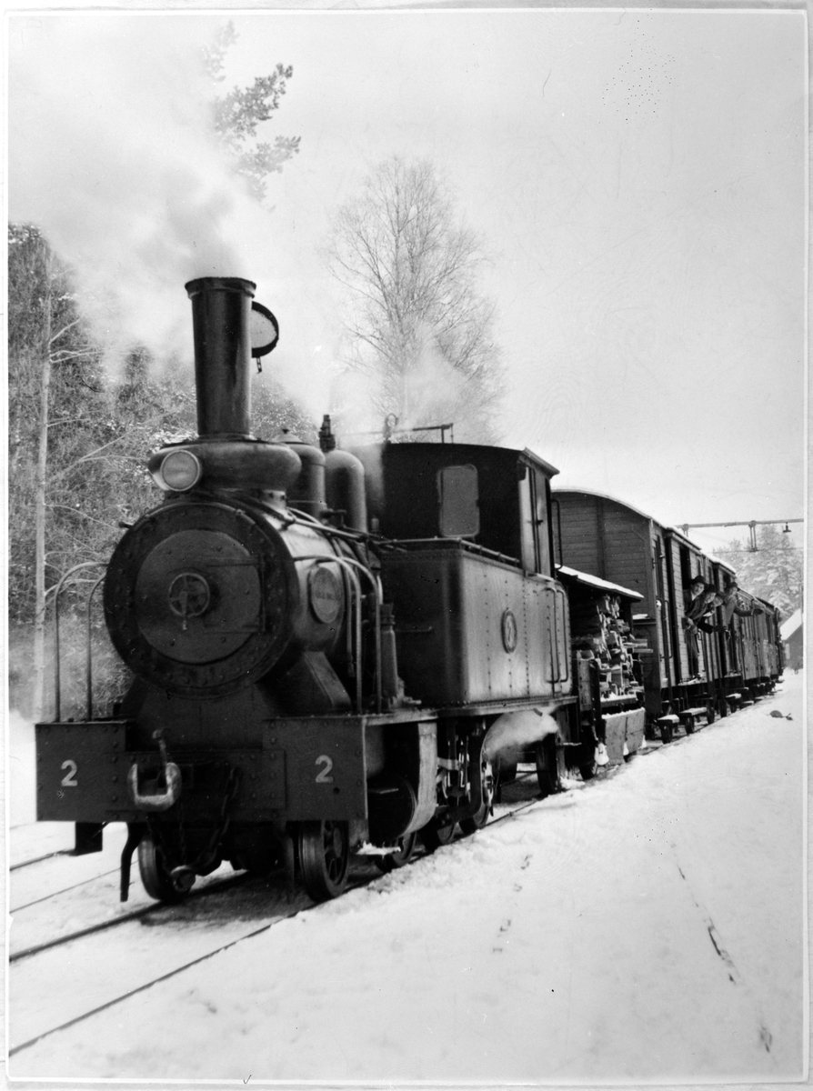 Ånglok 2, ett vedeldat lok. Resande hänger ut från sidan av godsvagnen.