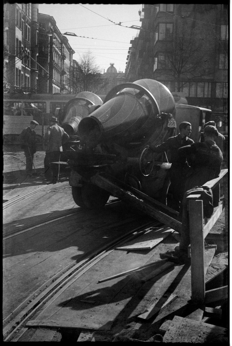 På Odenplan i Stockholm utförs spårvägsarbete.