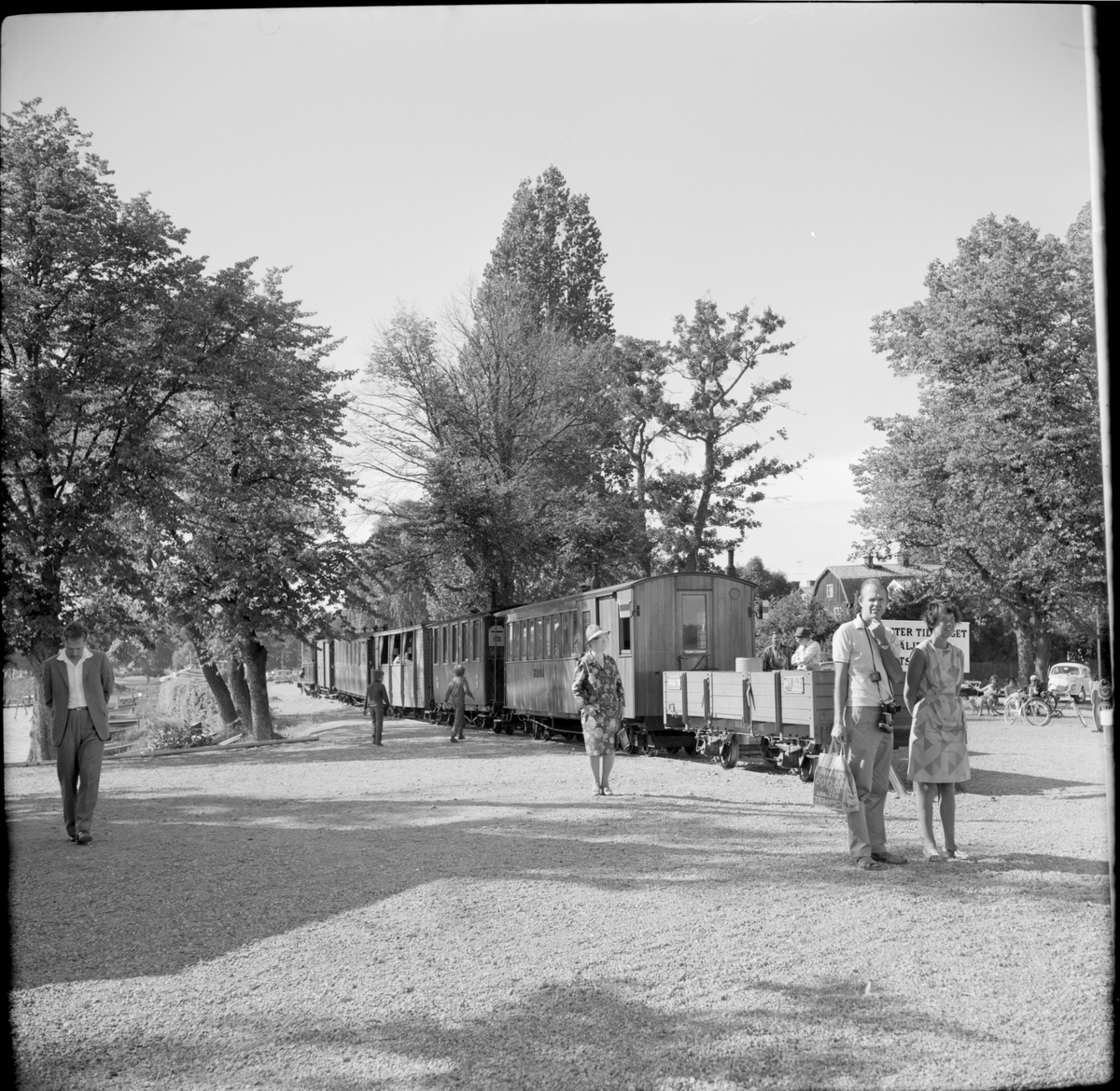 Museijärnvägen, Östra Södermanlands Järnväg, ÖSlJ ångtåg med resande vid hållplats på ångbåtsstationen i Mariefred. Närmast till höger i bild Nättraby - Alnaryd - Älmeboda Järnväg, NAEJ I 70 och Helsingborg - Råå - Ramlösa Järnväg, HRRJ personvagn 7.