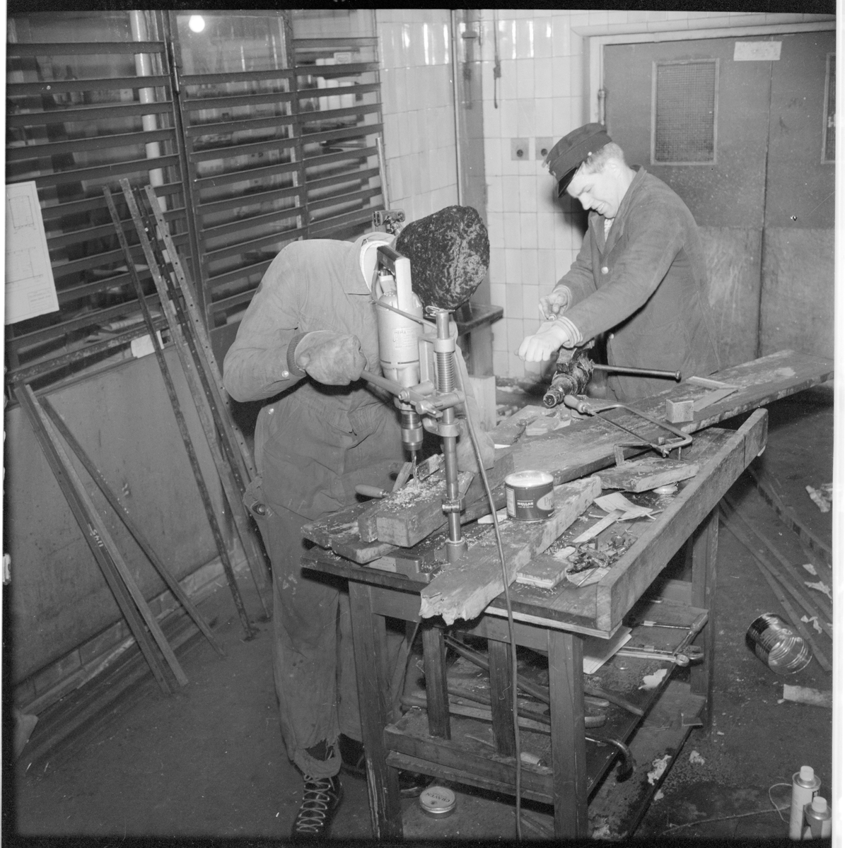 Personal i arbete vid pelarborren och skruvstycket. Troligen vid Museijärnvägen, ÖSlJ Östra Södermanlands Järnväg, ÖSlJ.