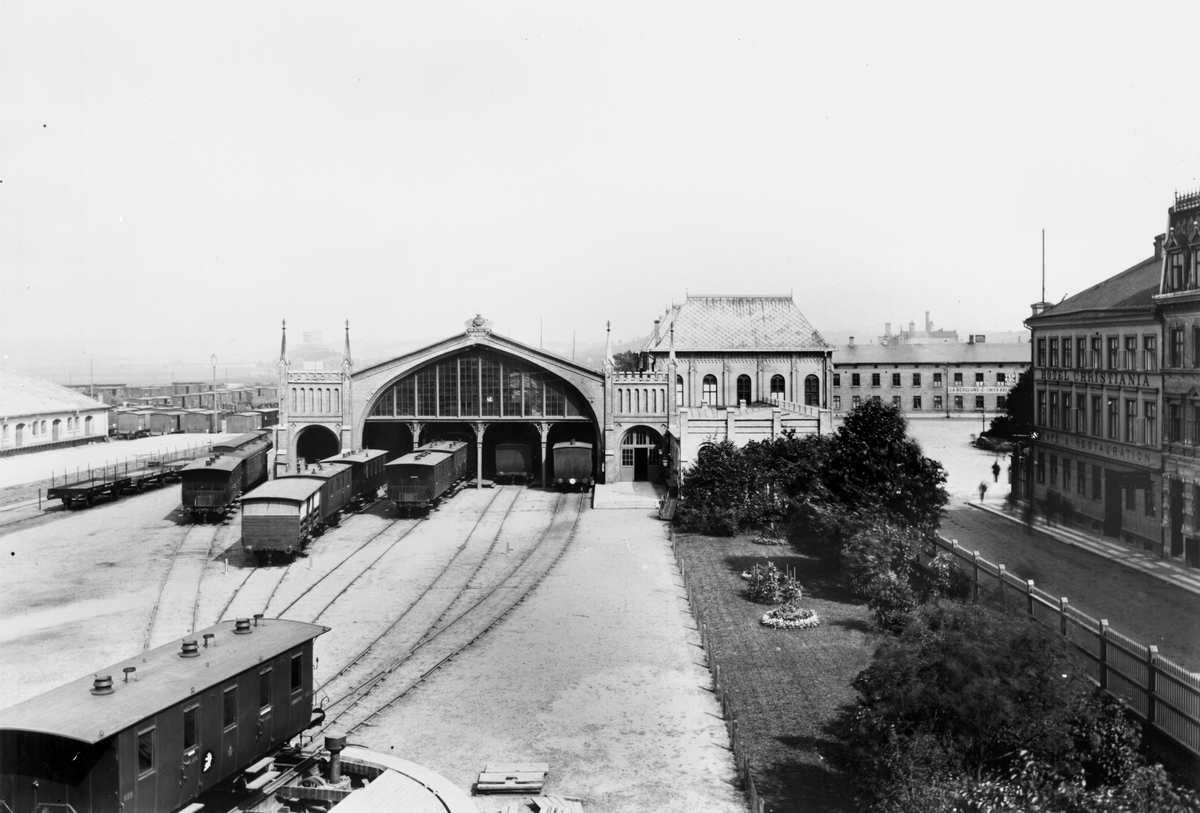 Vy över Göteborg Centralstation banhall och bangård med vändskiva i nederkant av bild.