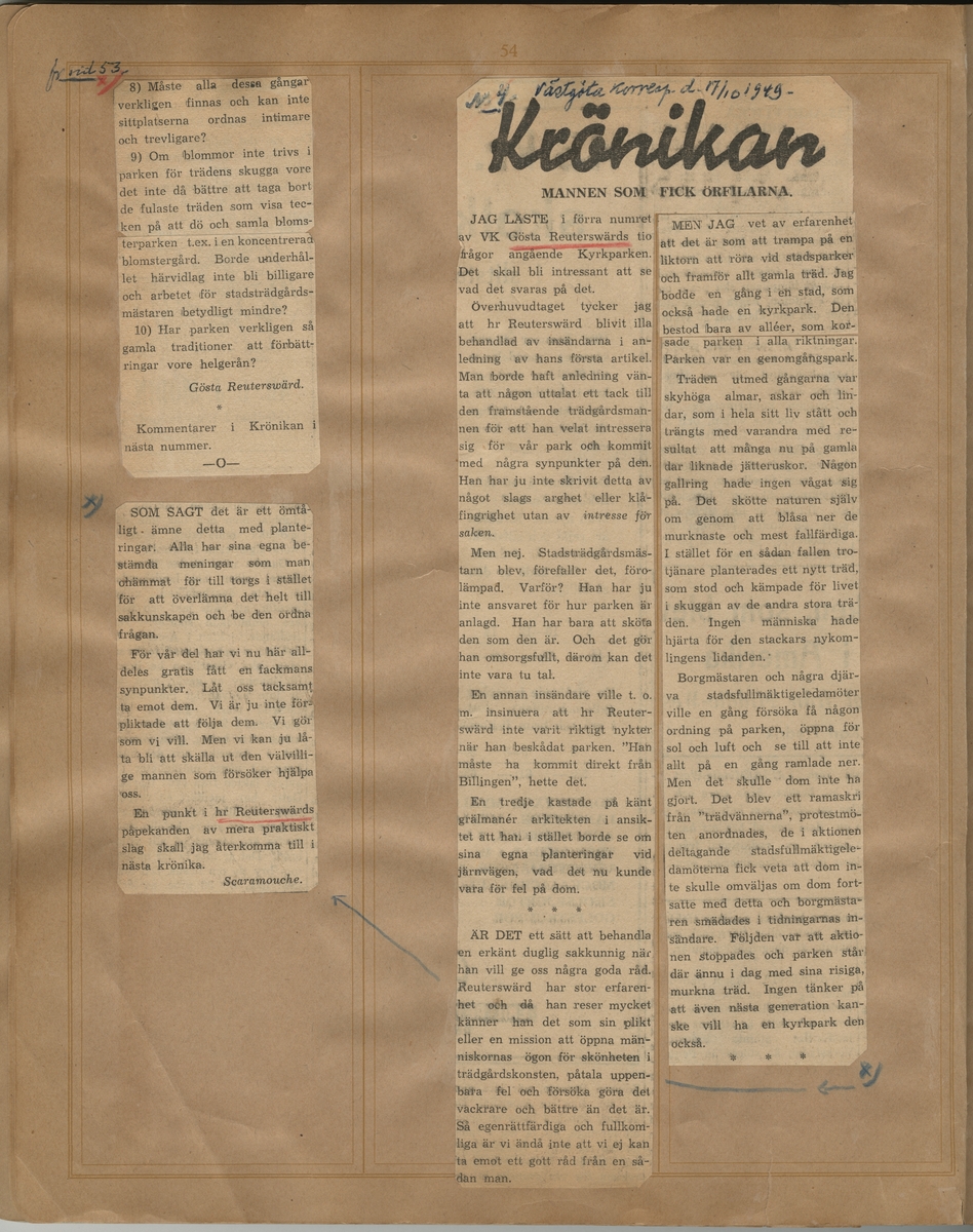 Tidningsklipp ur "Uppsatser om trädgårdar m.m. som på ett eller annat sätt beröra Gösta Reuterswärd. Samlade av Ernst Hj."