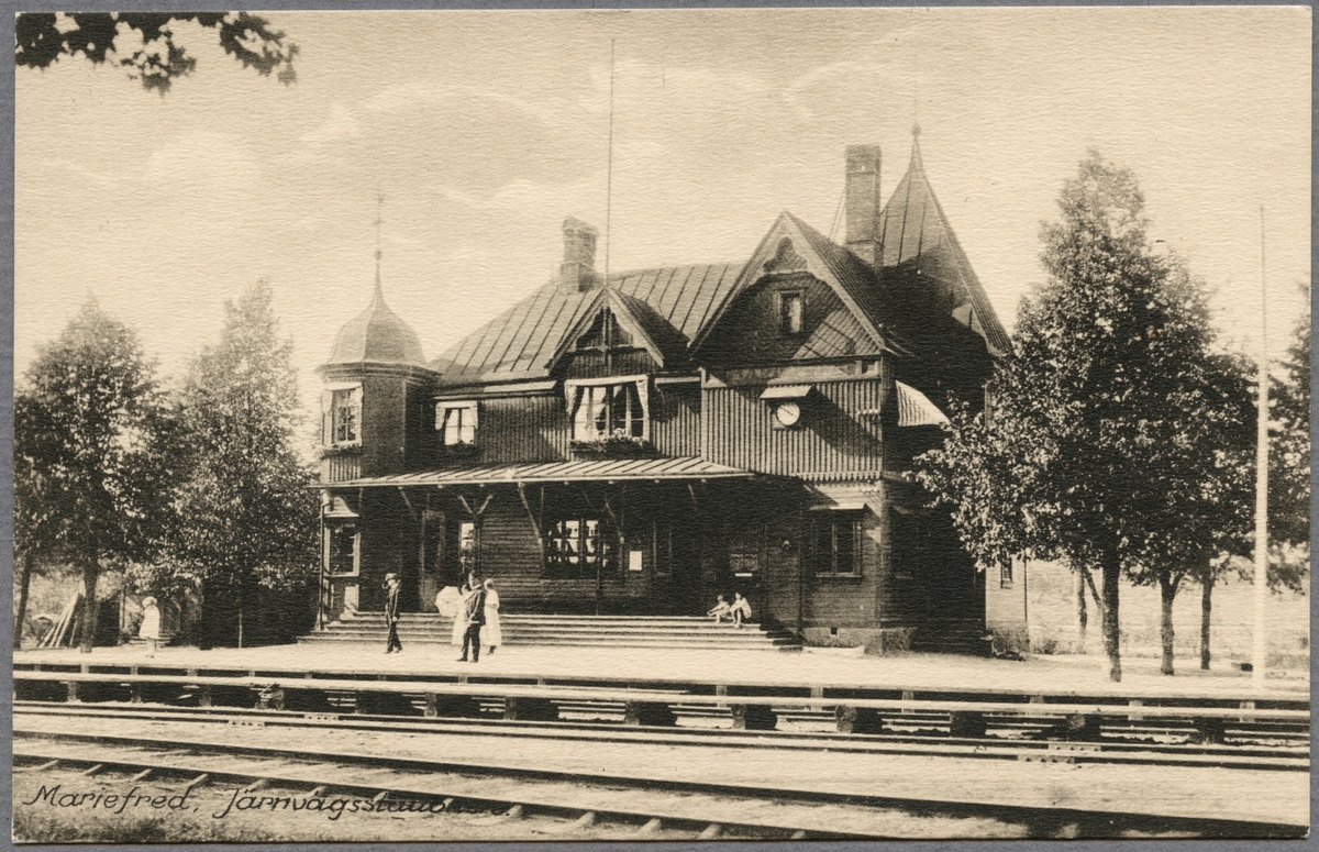 Titel: Vuxna och barn framför Mariefred järnvägsstation.