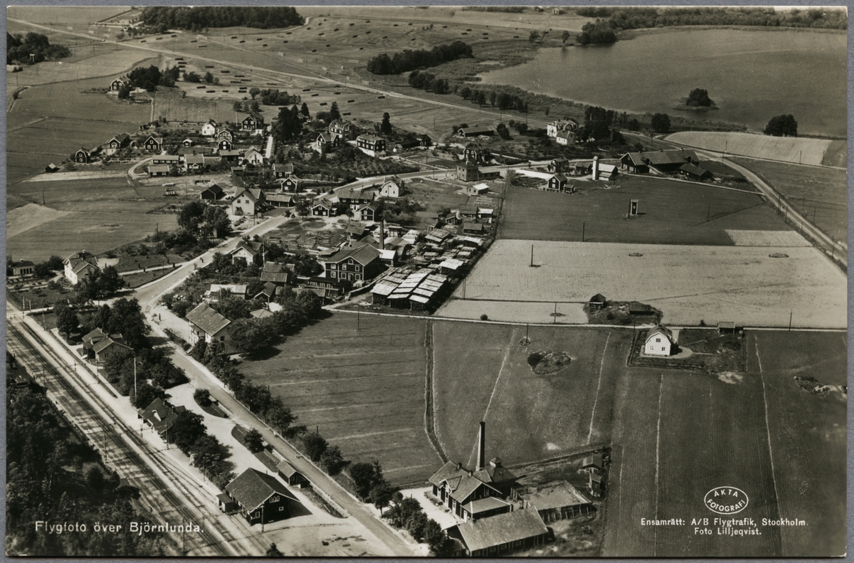 Vy över Björnlunda. Den mittersta byggnaden parallellt med järnvägsspåret är stationshuset.
