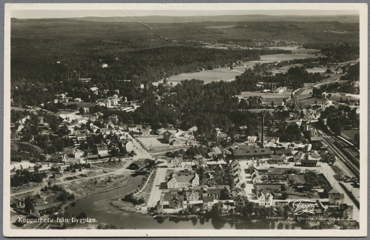 Flygfoto över Kopparberg med industri- och stationsområde i bild.