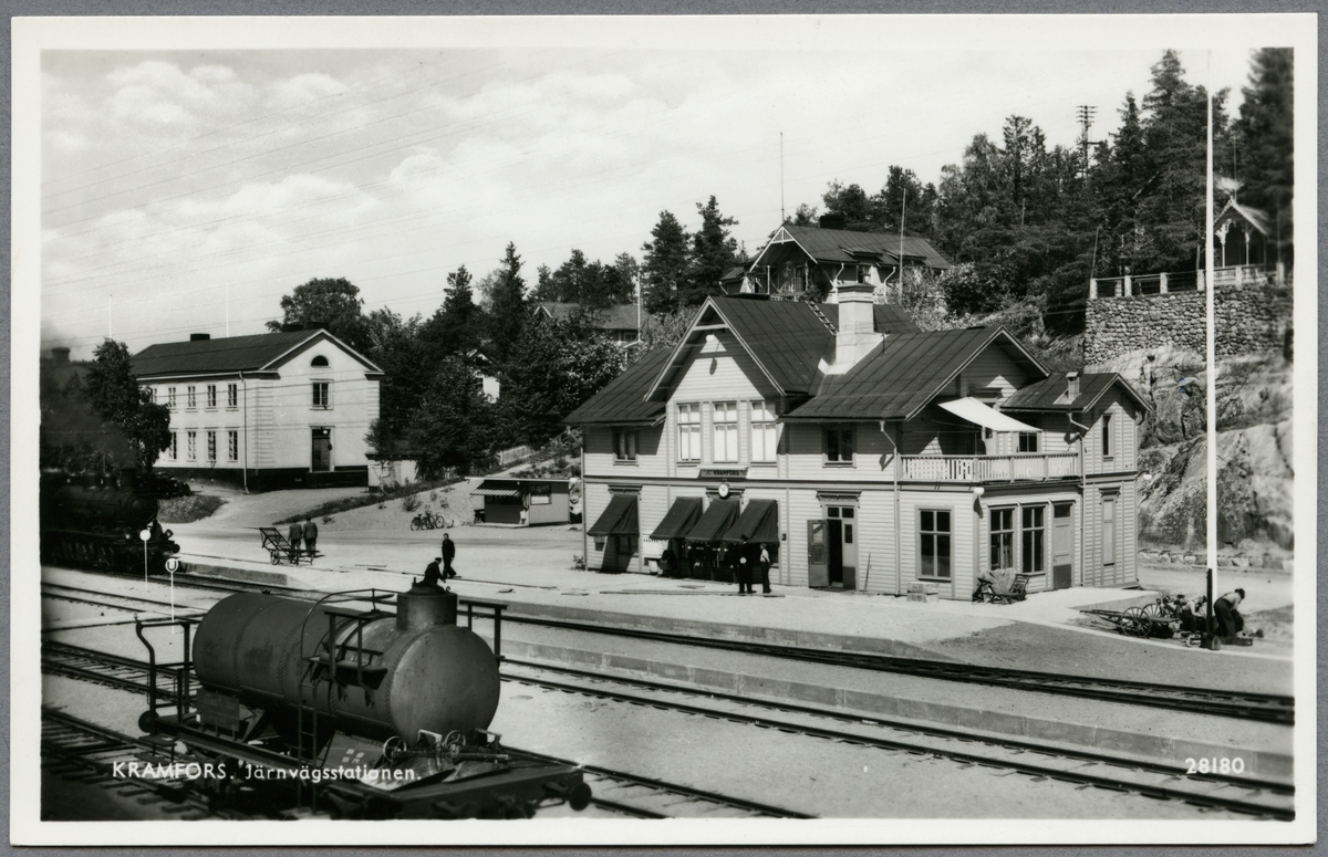 Titel: Kramfors station sedd från spårsidan med samhälle i bakgrunden.