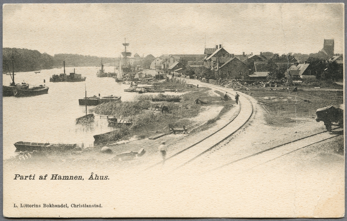 Titel: Hamn i Åhus med stad i bakgrunden.
