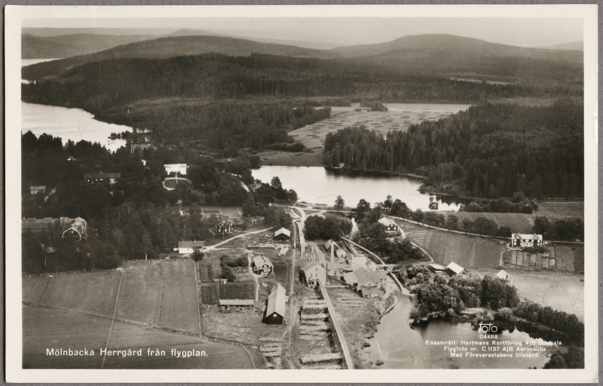 Flygfoto över de byggnder som fanns kvar efter det månghundraåriga Mölnbacka Bruk, till höger om det gamla bruket syns kvarnen samt kraftstationen som byggdes efter nedläggningen.