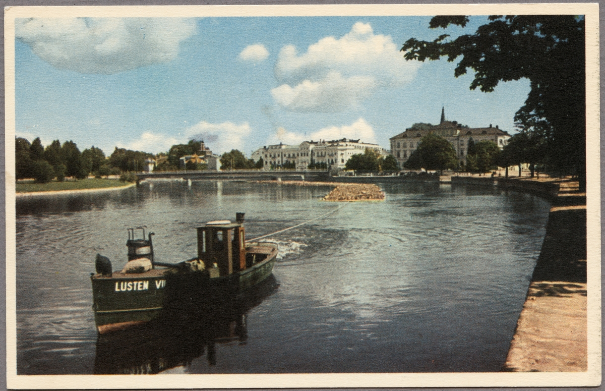 Titel: Fraktbåten "Lusten VII" flottar timmer på Klarälven.