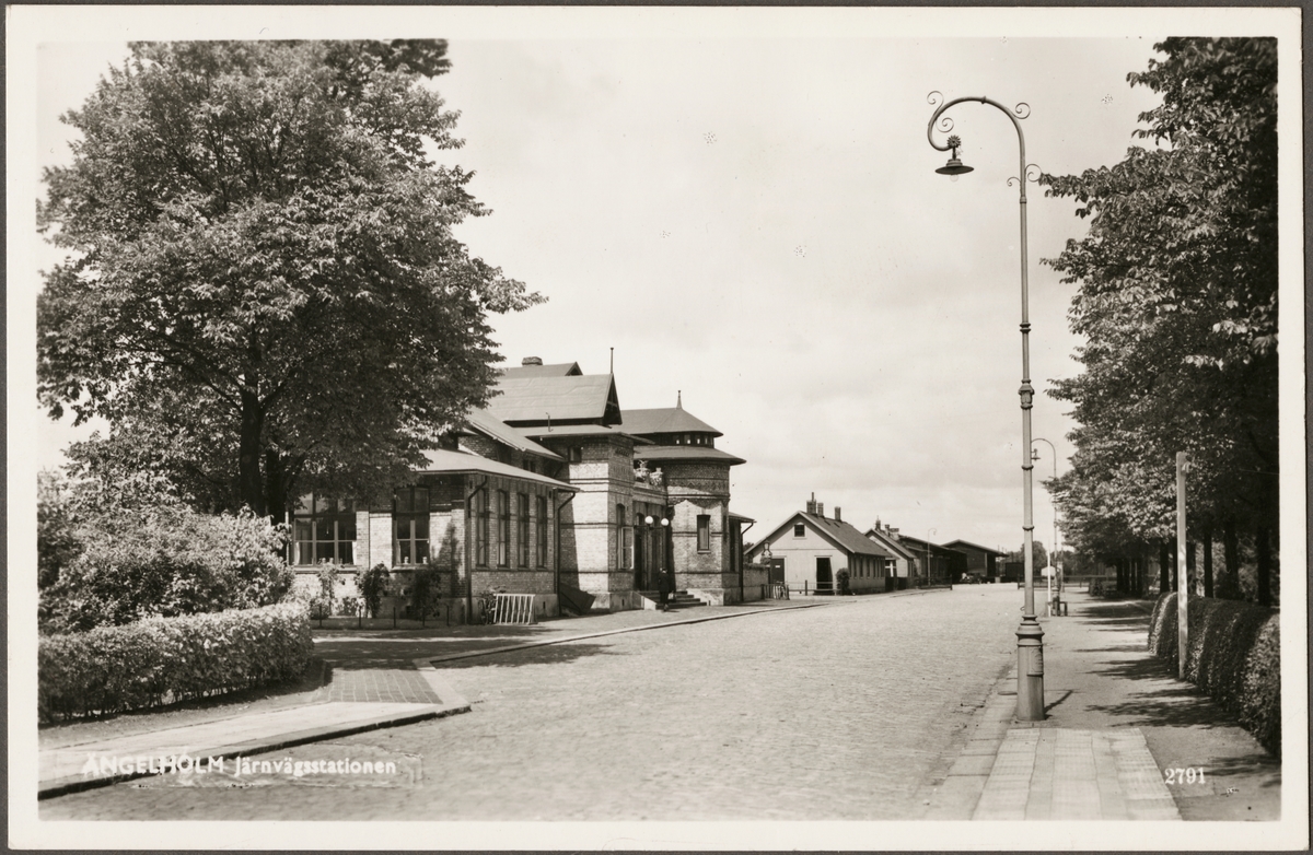 Titel: Gatusidan av järnvägsstationen i Ängelholm.