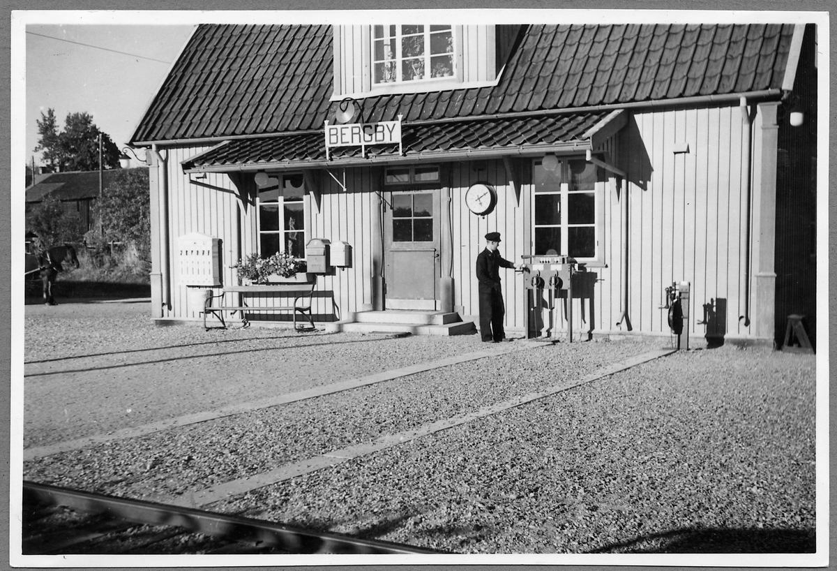 Ostkustbanan, OKB stationshus i Bergby. Station öppnad 1926 med en- och en halv vånings stationshus i trä. Banan förstatligades 1933. Den elektrifierades 1953. Stationen upphörde 1965.