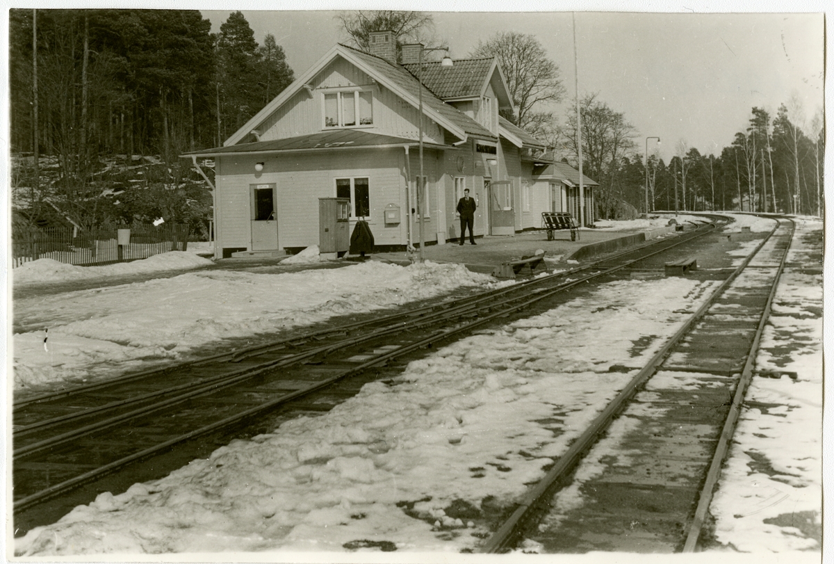 Titel: Stationen anlades 1874 och har senare tillbyggts och moderniserats. Bangården har utbyggts med ett spår. Stationshus i trä i en och en halv våning.