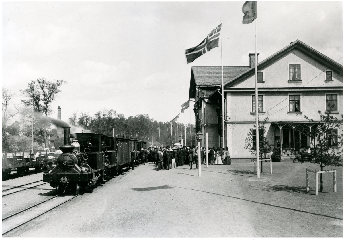 Oscar II på besök 1898. Lok SB 2 och SB 4. SB är förkortning för Skyllbergs bruk. Kolorerat vykort fmed samma motiv finns i arkivet med texten - Konungens afresa från Skyllbergs bruk. Örebro konstindustri AB. 2129.
