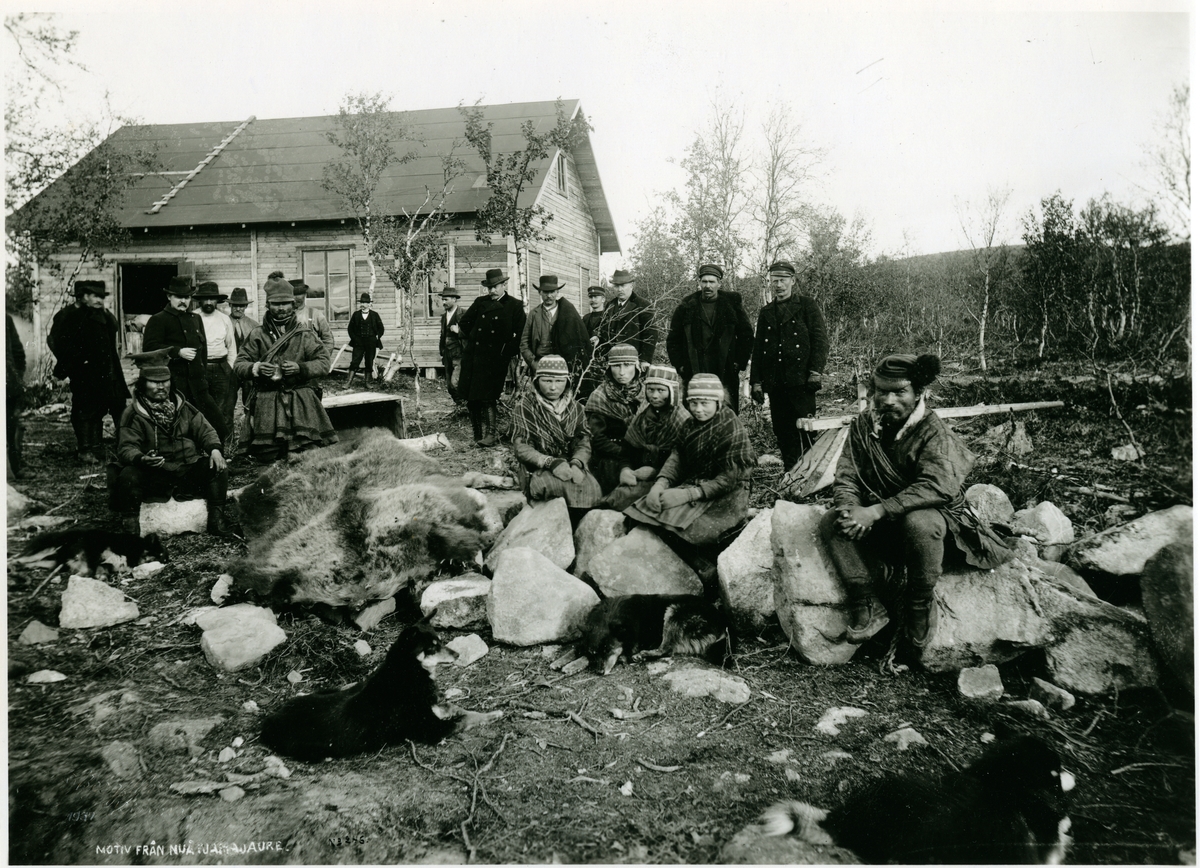 Samer och arbetare framför förrådsbyggnaden vid Rensjön. Byggnadsingenjör Höijer synes luta mot björken och doktor Skanthe står 2 man till höger om honom. Björn som passerat järnvägsbanken ligger skjuten dem.