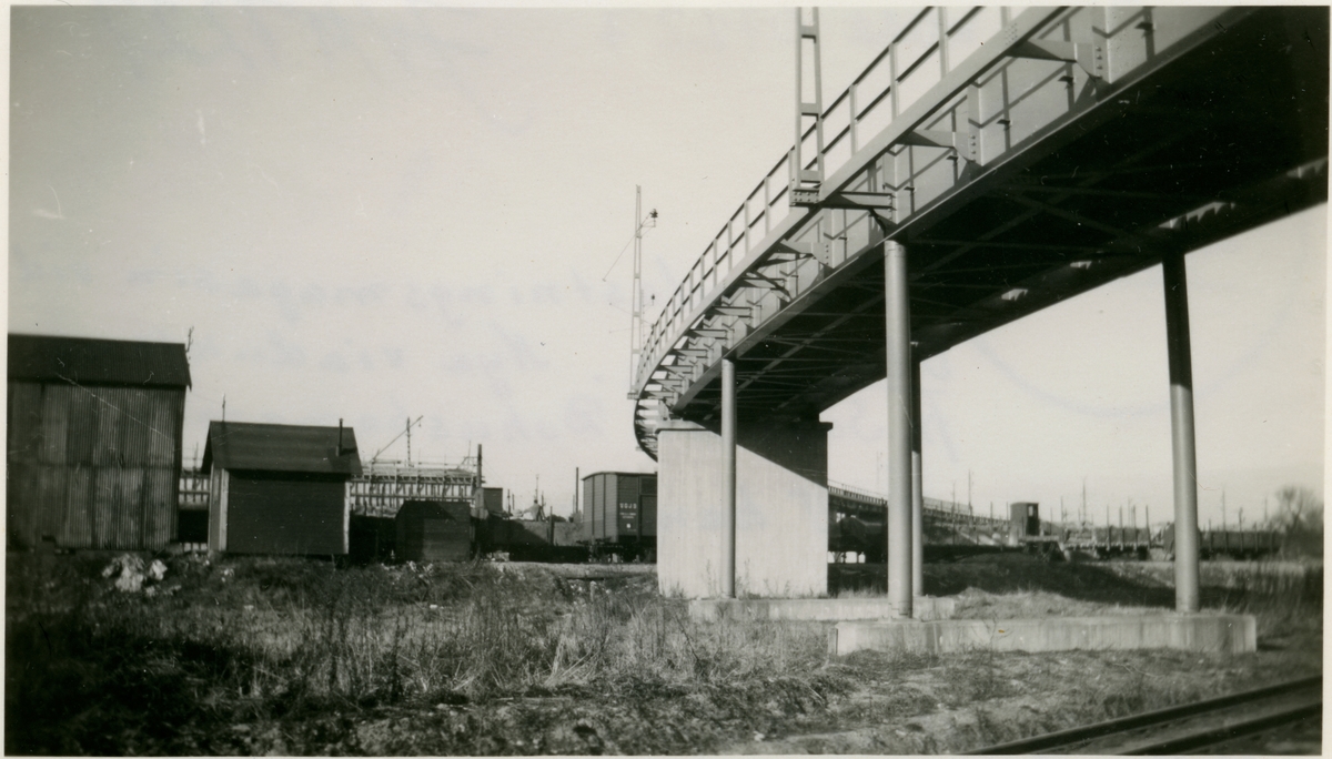 VGJ, Västergötland - Göteborgs Järnvägs omlastningsmagasin vid Olskroken. Nya viadukten från Säve till Bohusbanan. VGJ hamnspår skymtar i bakgrunden. Över Säveån byggdes först en provisorisk träviadukt, eftersom man räknade med att bangården kanske skulle byggas om. Detta blev dock inte av, och provisoriet ersattes av en järnviadukt 1930.