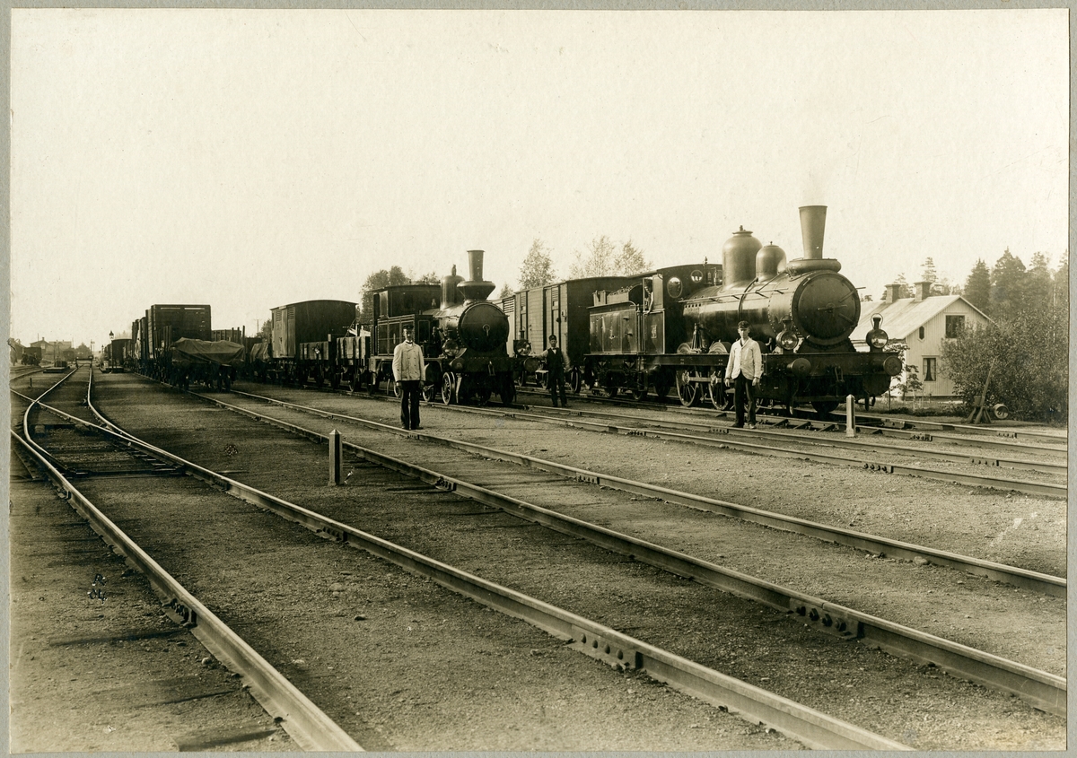 Statens Järnvägar, SJ, spår 4 NKJ lok 8, spår 5 SJ Kd2 408, Personal i i ljuva linnerockar. Stationskarl Julin, Stationskarl Karl Johannsson.