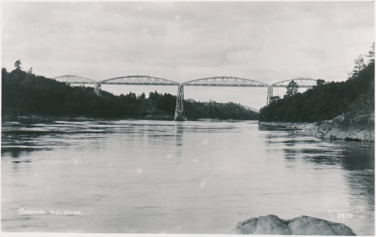 Österede. Statens Järnvägar, SJ. Indalsbron byggdes 1914 och den är 109 m. Bron byggdes för att skapa en fast och säker förbindelse mellan byarna på ömse sidor om älven. Den byggdes för gångtrafik men har även använts for hästkörning. Den var en gång livligt trafikerad av ortsborna, framför allt skolbarn som bodde på södra sidan av älven och gick i skola i Ede.