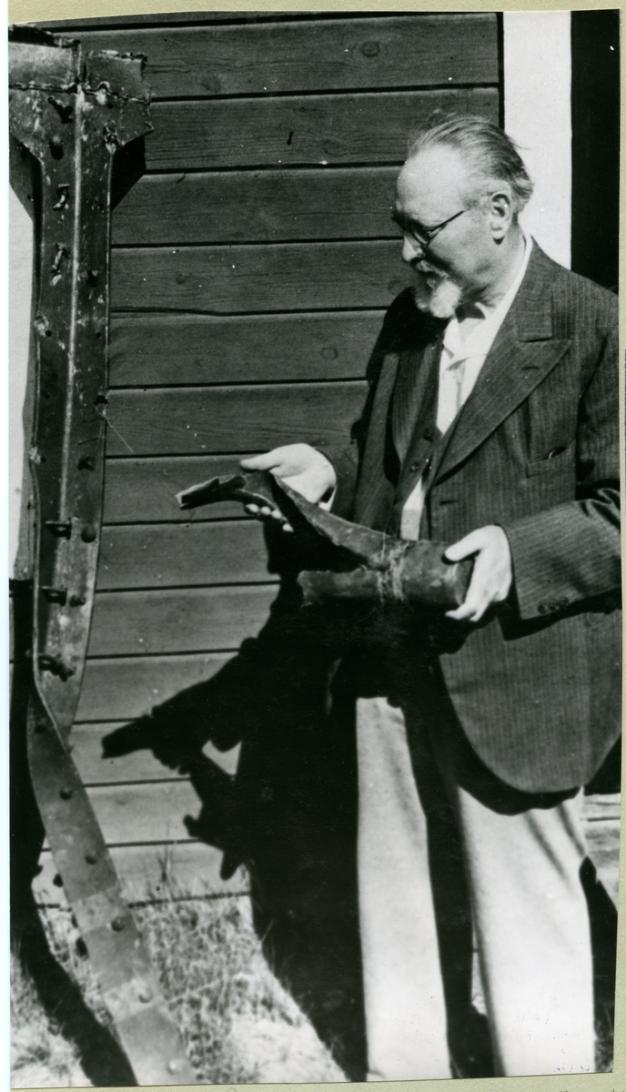 Krylbo-olyckan. Häradsdomare A.T. Jernberg bredvid vagnsdel, ihållandes en detonerad fransk spränggranat som fanns med i lasten enligt Krylbokommisionens utlåtande.