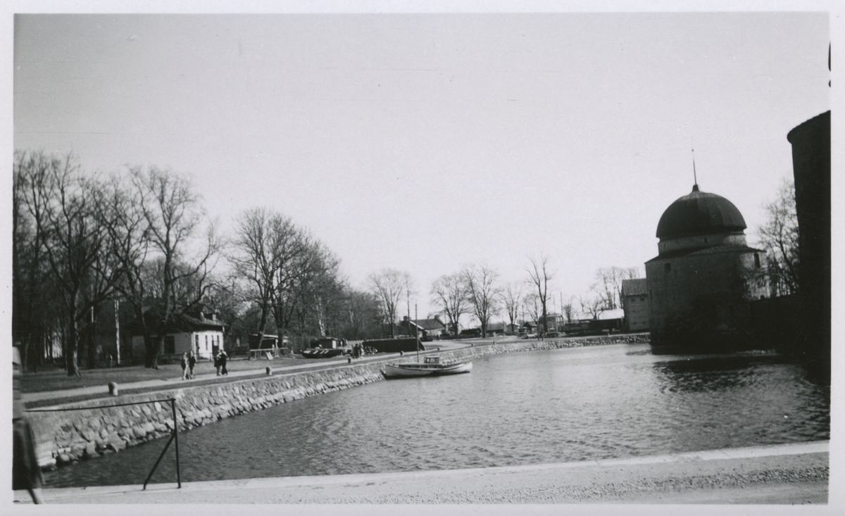 Vadstena stationshus är den vita byggnaden till vänster. Spåret följde träden i bakgrunden och kurvade åt vänster. Slottet till höger.