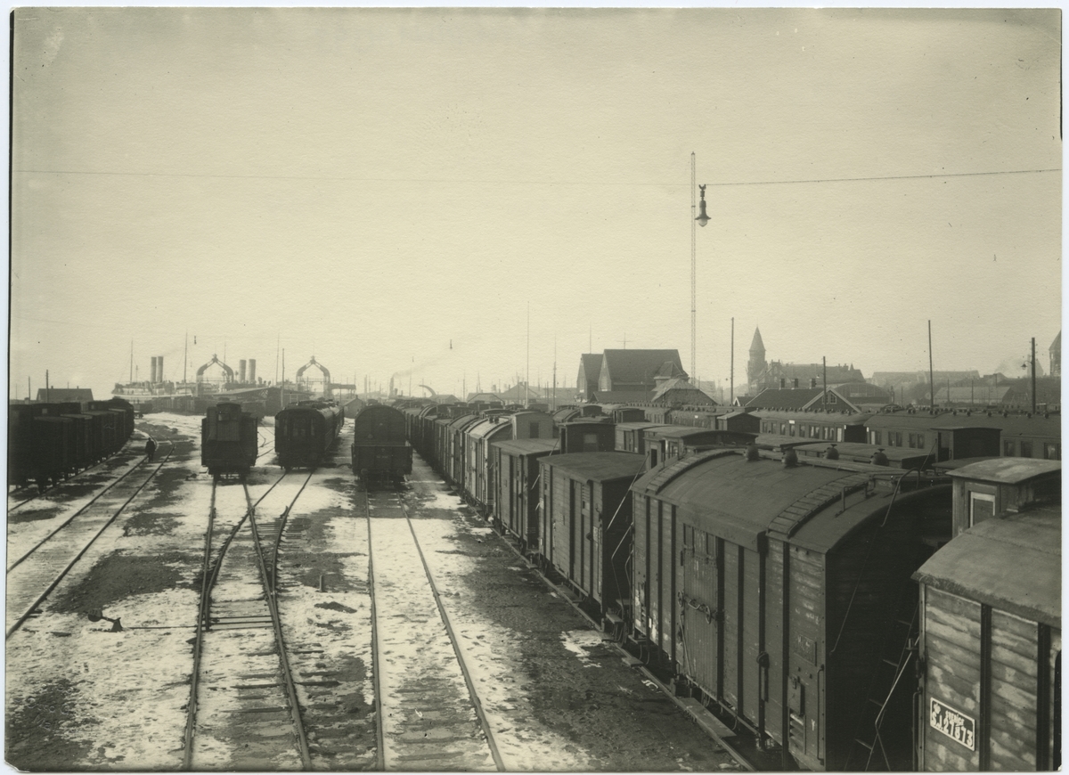 Vagnanhopning på bangården under isblockaden vid Trelleborg färjestation. Statens Järnvägar, SJ godsvagn 27873.