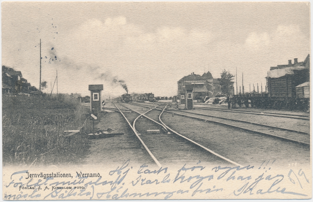 Wernamo station. Halmstad-Nässjö Järnväg, HNJ. Första stationshuset byggdes 1877 och revs 1995 för att det stod i vägen för en planerad vägkorsning. Första lokstallet byggdes 1875 men revs 1894 och ett nytt byggdes på annan plats på bangården. Ett nytt stationshus byggdes 1899 av Skånes-Smålands Järnväg, SSJ men byggnaden användes aldrig som järnvägsstation då SSj och HNJ enades om att använda HNJ station. 1902 byggdes ett nytt gemensamt stationshus vid godsmagasinet. 1903 anslöts Borås- Alvesta, BAJ hit och då byggdes ett nytt godsmagasin som bekostades av BAJ. Detta magasin tillbyggdes 1918 och 1935. HNJs gamla stationshus flyttades 1902 och blev bostads- och överliggningshus.