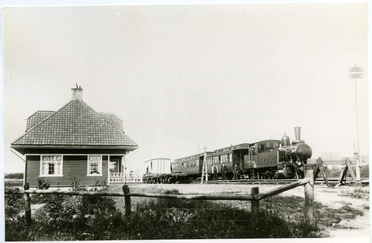 Malevik, på sidospåret synes en "vit" vagn. Det är GSJ första sommarvagnstyp. N-vagn på vars trästolpar ett tak lades upp och vagnen draperades med blå och vitrandig duk.
