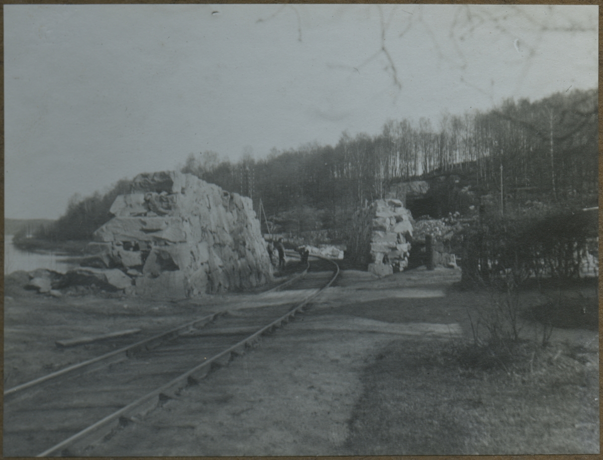 Dubbelspårsbyggnaden mellan Alingsås - Olskroken. "Raset" Rasviken. Gamla järnvägslinjen före raset, i bakgrunden synes tunneln för nya linjen.