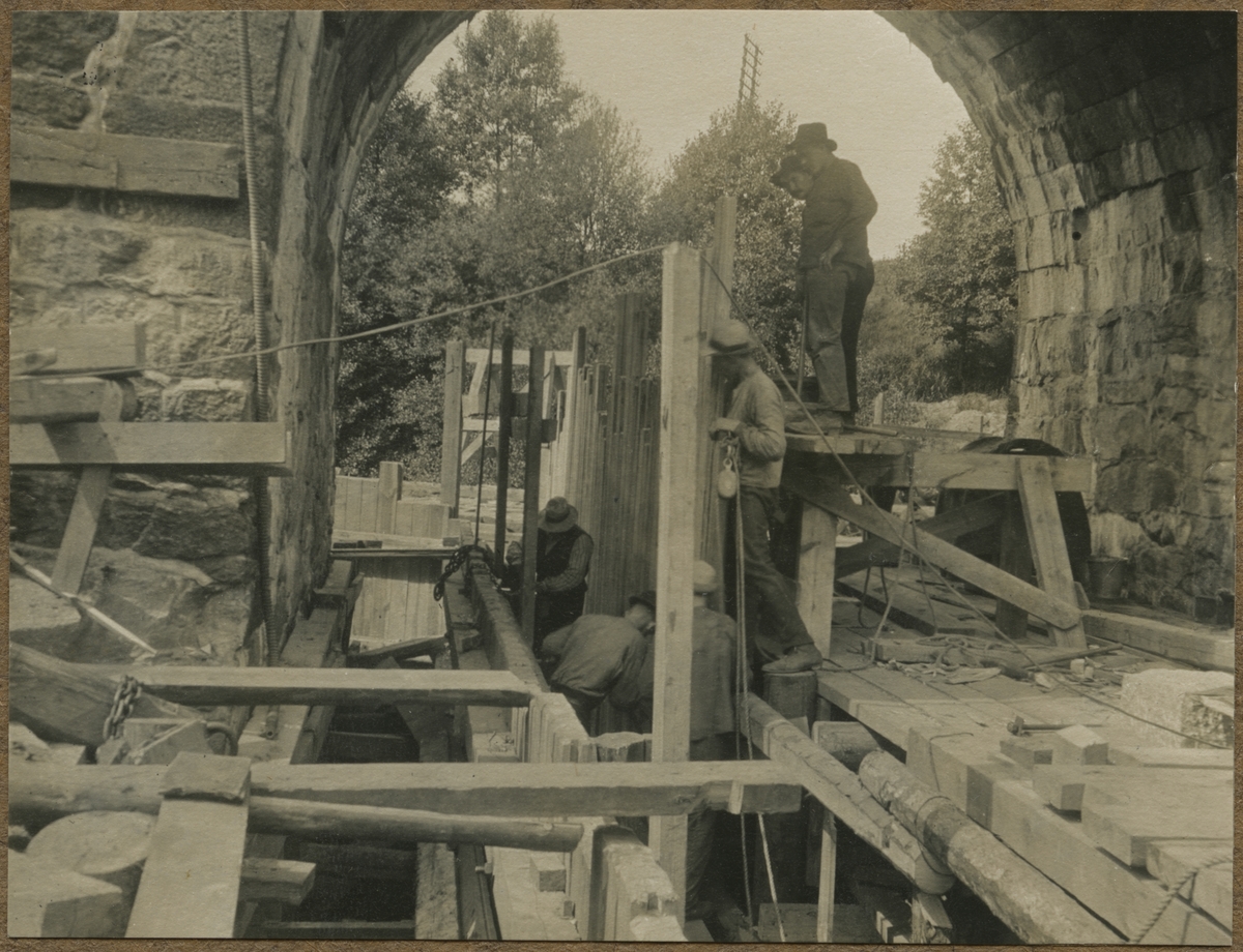 Dubbelspårsbyggnaden mellan Alingsås - Olskroken. Bron över Säveån södra brohalvan. Nedslagning av spånt.