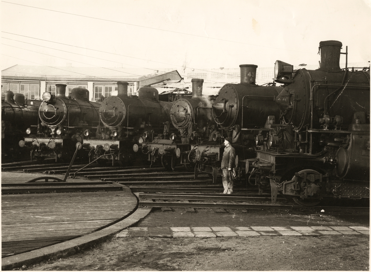 Sundsvall lokstation, uppställda ånglok. Från vänster Statens Järnvägar, SJ B 1290, SJ B 1312, SJ E2 903, SJ B 1430 med HHJ tender no 1 och SJ B 1268.