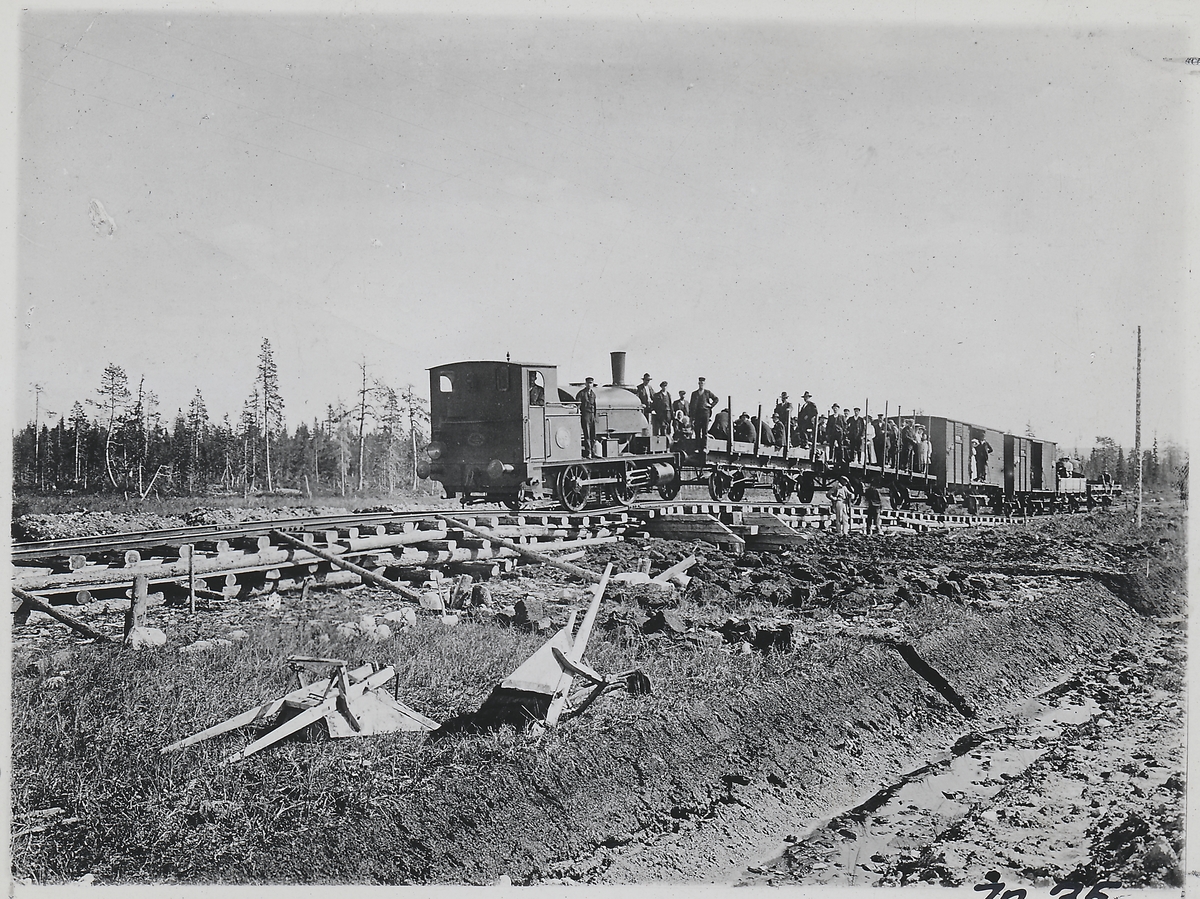 Arbetsspåret mellan Gällivare - Porjus våren 1911. Tjällossningen har gjort sitt och verkligen gjort spåret krokigt. Spåret snabbyggdes för att snabbt kunna transportera material till bygget av Porjus kraftverk. Det brådskade med kraftverket eftersom det skulle leverera kraften till den elektriska driften av Malmbanan.