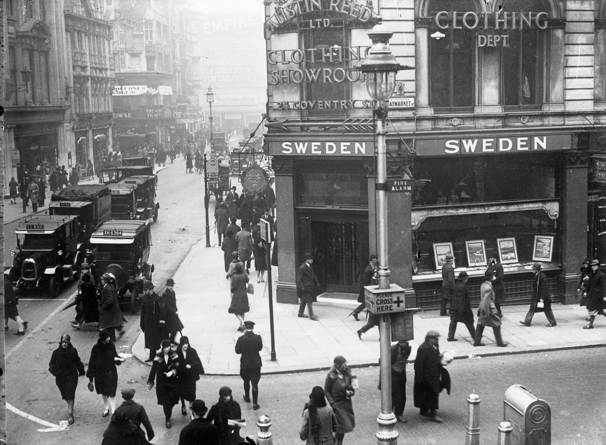 "Swedish Travel Bureau" på Coventry street i London. Resebyrån öppnades 1921 av Svenska Turisttrafikförbundet men övertogs 1924 av SJ Resebyrå. I samband med övertagandet så bytte resebyrån namn till "Swedish Travel Bureau" som den har på bilden.